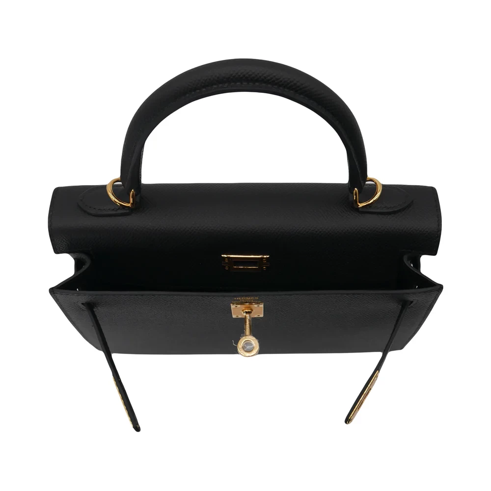 This Hermès inspired Kelly 25 features Black Epsom leather. Gold hardware adds classic contrast to the dark tone. The 25cm sellier design stays structured and polished. Scratch resistant leather maintains sharp lines. Pairs with any outfit for instant sophistication. Your perfect everyday luxury staple. Timeless elegance perfected.