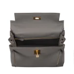 This Hermès inspired Kelly 28 uses Gris Etain Togo in smoky grey. Gold hardware warms the cool neutral tone. The retourne design offers relaxed sophistication for work or travel. Durable leather hides daily wear. Pairs with metallics or earth tones. Your perfect transitional season companion. Understated luxury for modern minimalists.