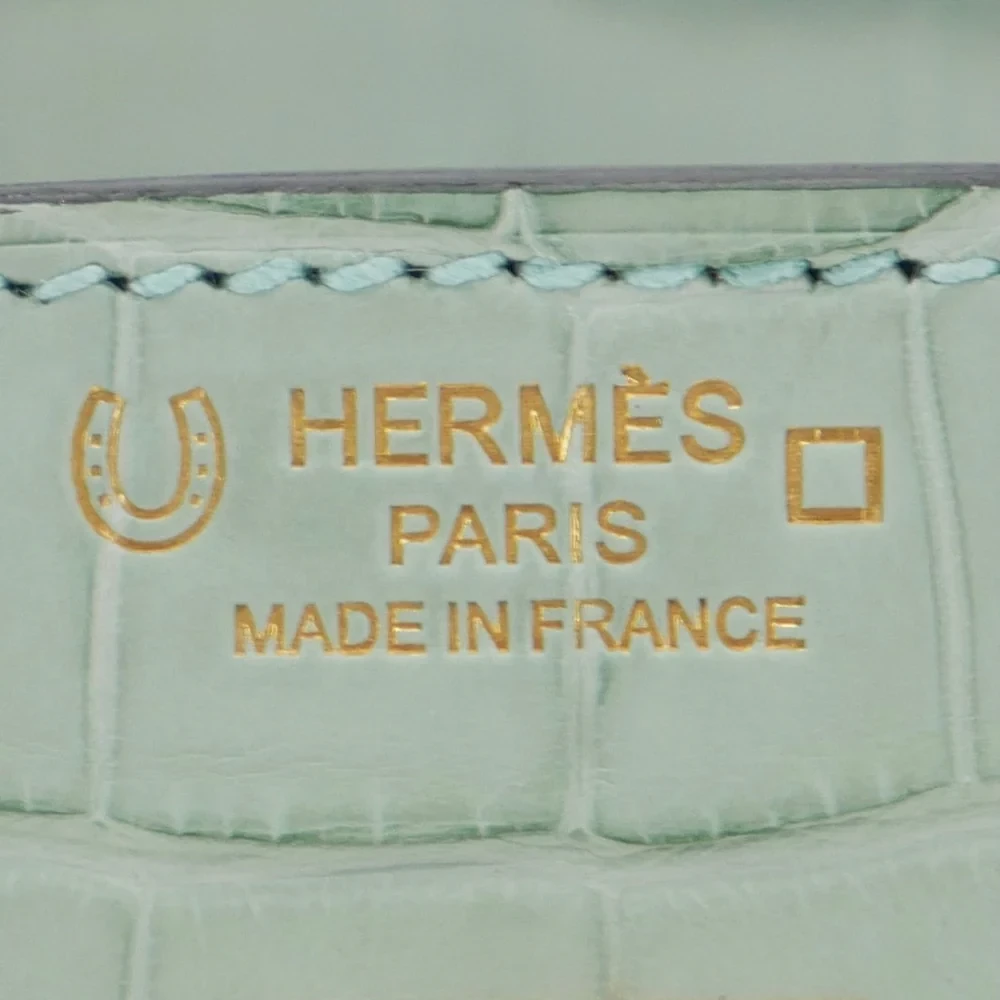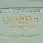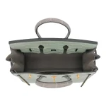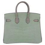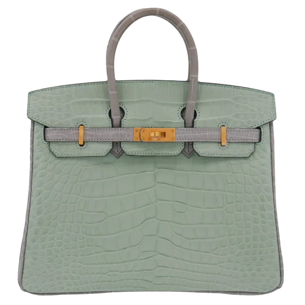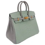 This Hermès Inspired Birkin 25 combines Vert D’eau and Gris Perle matte alligator. Brushed gold hardware adds subtle warmth. The 25cm size is perfect for special occasions. Matte finish resists fingerprints and stains. Pairs beautifully with silver and white outfits. Your perfect spring wedding companion. Watercolor luxury in bag form.