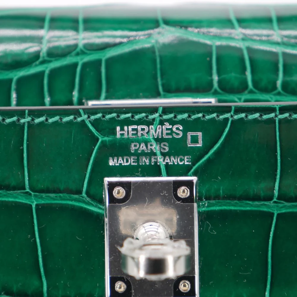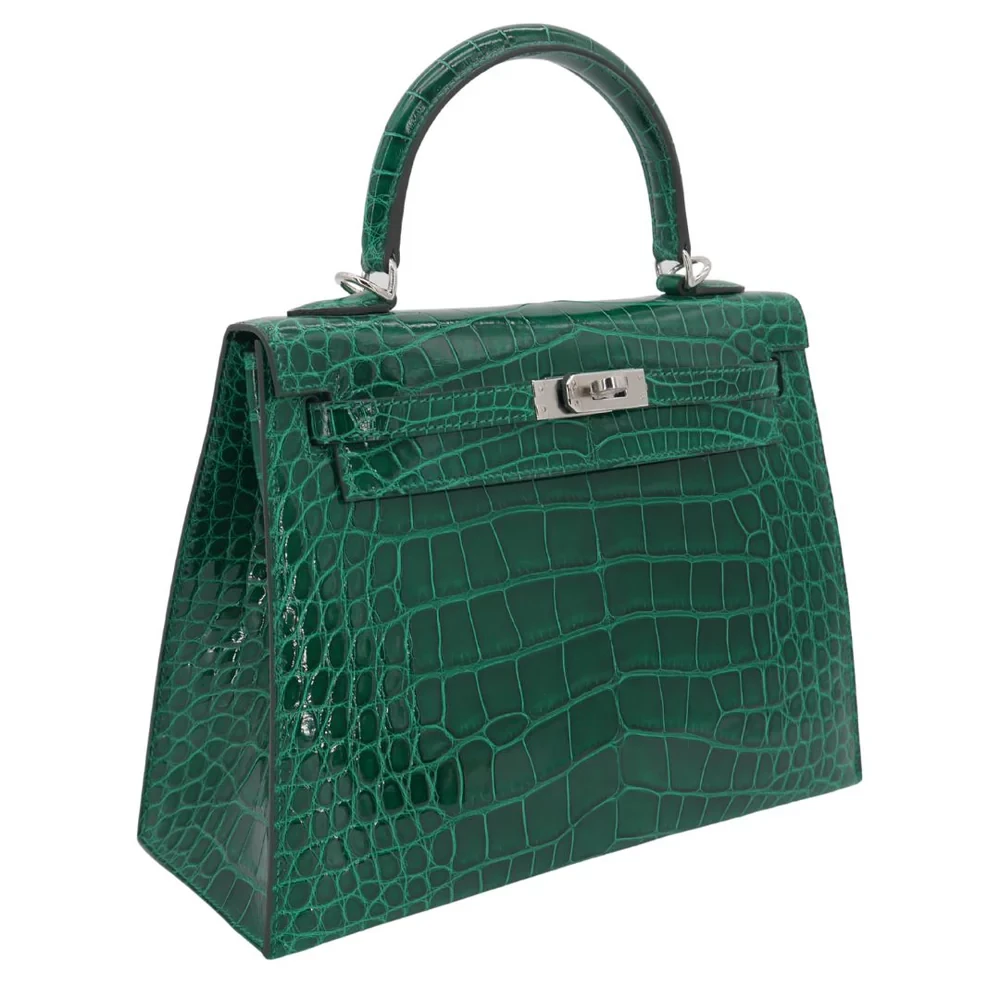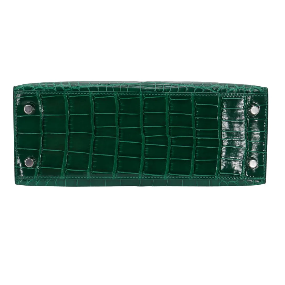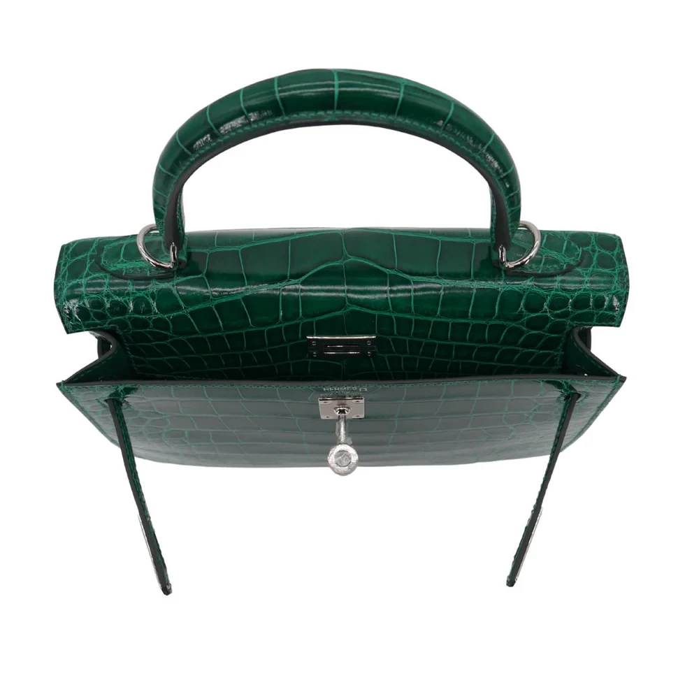 This Hermès style Kelly 25 features Emerald shiny alligator leather. Palladium hardware enhances the jewel toned green. The 25cm sellier design fits daily essentials neatly. Glossy finish resists scratches and maintains shine. Pair with gold jewelry for Old Hollywood glamour. Perfect for galas or luxury vacations. A statement piece for confident tastemakers.