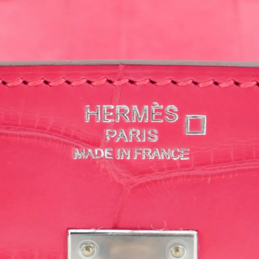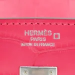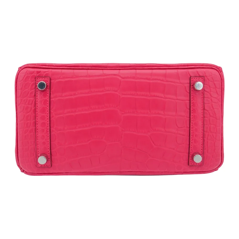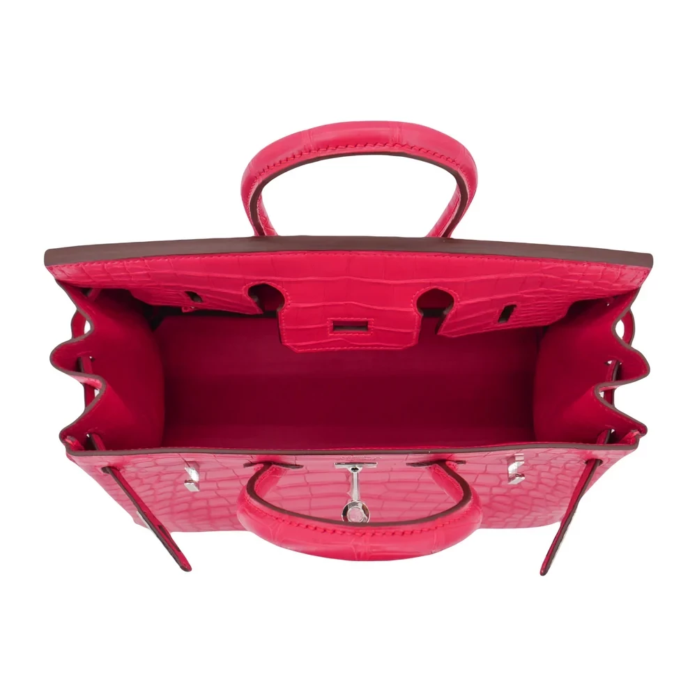 This Hermès style Birkin 25 dazzles in Rose Extreme matte alligator leather, a vivid hot pink. Palladium hardware cools the 25cm design with modern contrast. Matte alligator stays scratch resistant and eye catching. Compact yet fits essentials like lipstick and cards. Pair with neutrals for bold pop. Perfect for parties or summer events. Unapologetic glamour.
