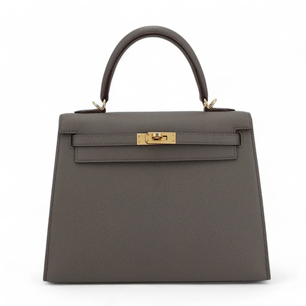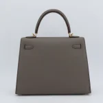This Hermès inspired Kelly 32 showcases Etain Epsom leather in sleek, pewter grey tones. Gold hardware highlights the slouchy silhouette and functional design. The 32cm spacious interior fits tech gadgets, books, and more. Epsom leather resists wear and stays polished. Style with black outfits or metallics for industrial edge. Built for city life, travel, or modern wardrobes. Urban refinement.