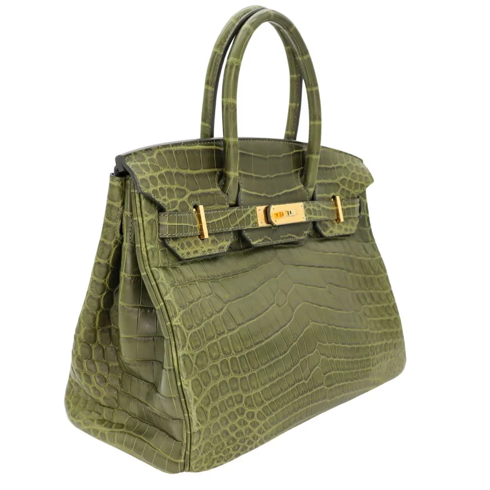 This Hermès inspired Birkin 30 glows in Canopee matte Niloticus crocodile leather, a muted sage green hue. Gold hardware adds warmth to the earthy 30cm silhouette. Matte crocodile stays fingerprint resistant and durable. Roomy enough for work essentials or weekend adventures. Pair with neutrals or autumnal tones for harmony. Lightweight and timeless for everyday sophistication. Nature inspired luxury at its finest.