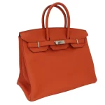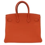 This Hermès inspired Birkin 35 glows in Terre Battue Togo leather, a warm terracotta shade. Palladium hardware adds modern contrast to the oversized 35cm design. Roomy enough for laptops, books, or travel gear. Scratch resistant Togo leather stays durable for daily use. Pair with earthy tones or autumnal hues. Ideal for work or weekend getaways. Rugged elegance meets practicality.