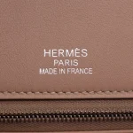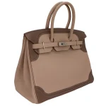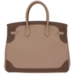 This Hermès like Birkin 35 mixes clay brown and grey Swift leather. The silver palladium hardware gives it a rugged, modern look. The 35cm size is huge enough for travel or work files. Ghillie detailing adds a unique, artsy touch. The neutral colors hide dirt and wear. A practical bag for busy days. Style and function combined.