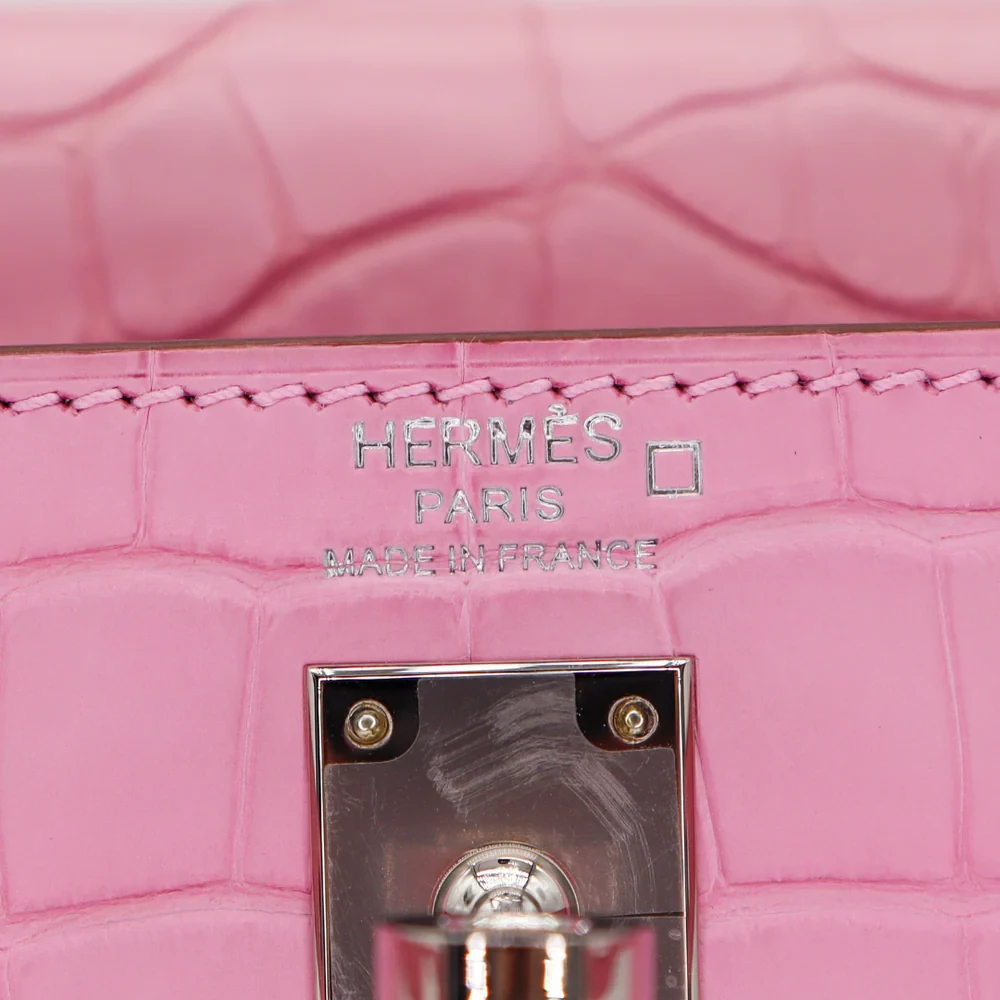 This Hermès style Kelly 25 features Bubblegum matte alligator. Palladium hardware cools the vibrant pink. The 25cm retourne style offers slouchy charm. Matte finish hides fingerprints and scratches. Brightens neutral outfits instantly. Playful luxury for bold personalities.