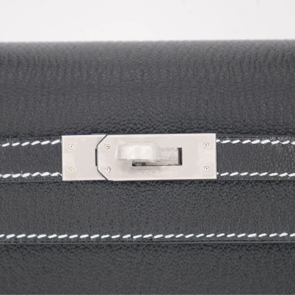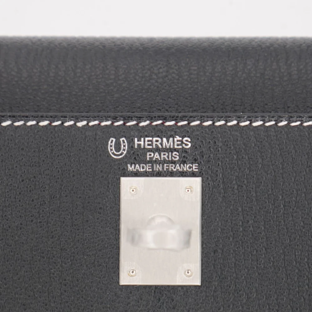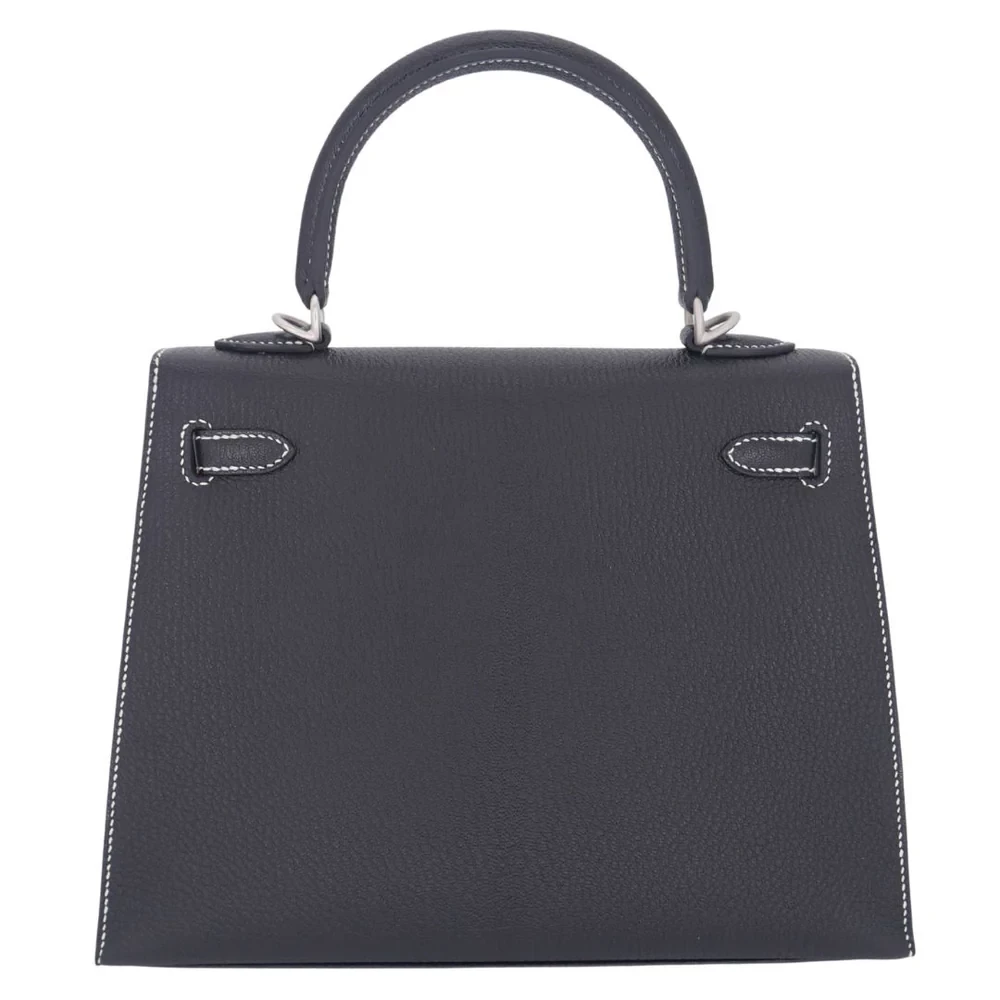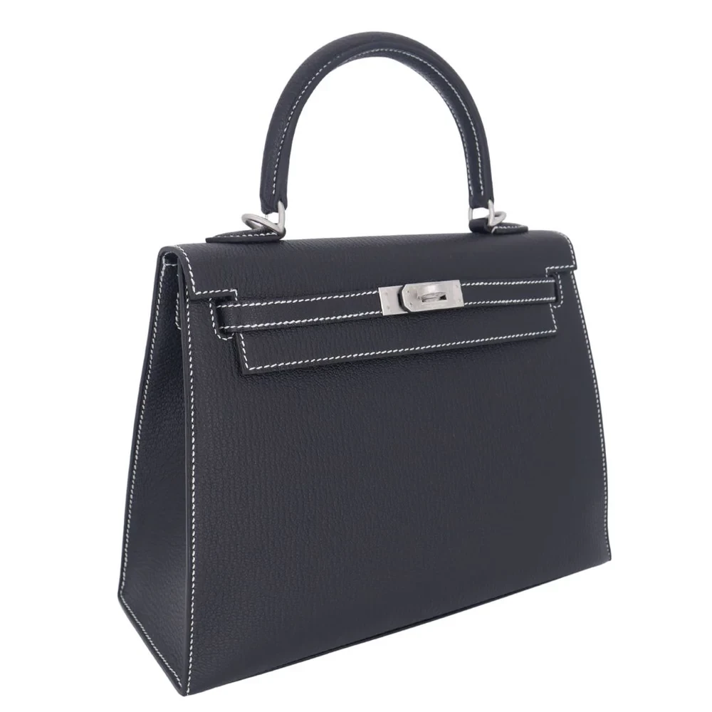 This Hermès style Kelly 25 features Black chèvre leather with brushed gold hardware. The 25cm sellier design offers structured professionalism. Buttery soft leather resists scuffs and stains. Elevates office attire or evening dresses effortlessly. Roomy enough for tablets and documents. Your perfect work to event companion. Sleek power in timeless monochrome.