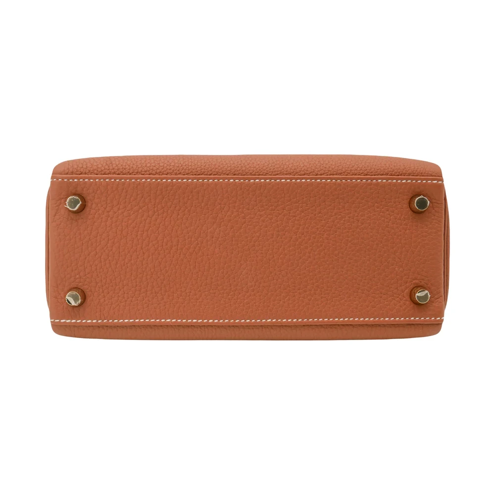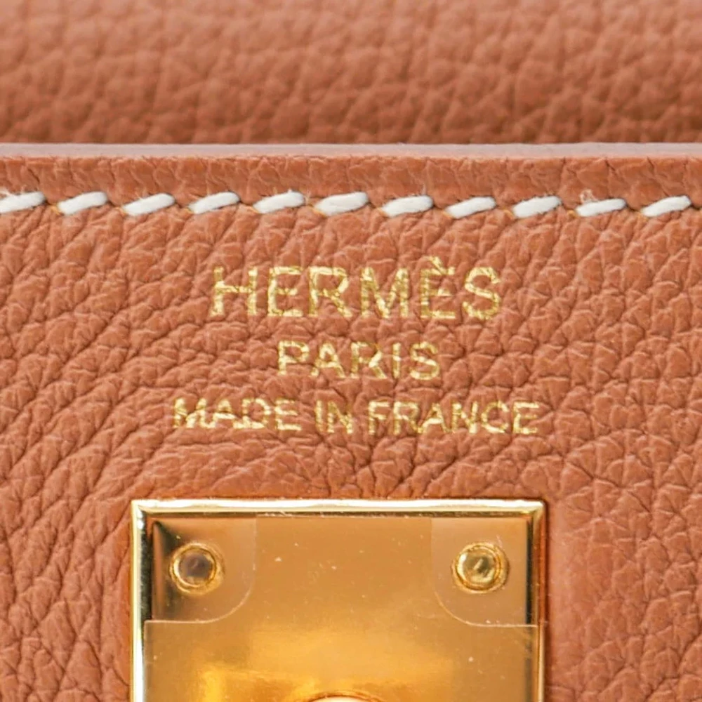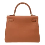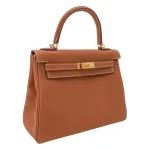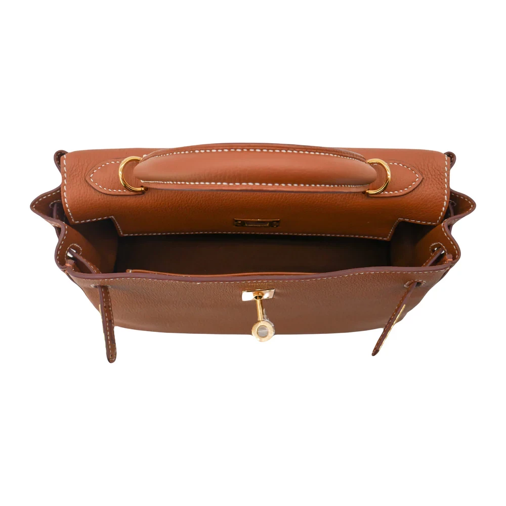 This Hermès style Kelly 25 features Gold Togo leather. Matching gold hardware creates warm harmony. The retourne design offers relaxed, slouchy elegance. Soft leather molds to your body over time. Perfect with earth tones or metallics. Your go to bag for brunches or travel. Effortless luxury for golden hour moments.