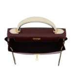 This Hermès Replica Kelly 28 combines Bordeaux and Craie Epsom leather. Brushed gold hardware adds subtle shine. The sellier style keeps perfect structure. Two tone design adds dimension. Elevates professional looks. Your perfect office companion with flair. Sophisticated luxury with personality.