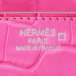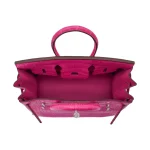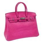 This Hermès style Birkin 25 pops in Rose Shocking matte alligator leather, a bold magenta pink. Palladium hardware cools the 25cm design with modern edge. Matte alligator resists scratches and stays sleek. Compact yet eye catching for parties or events. Pair with black for dramatic contrast. A fearless burst of color.