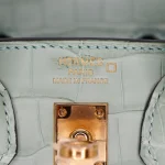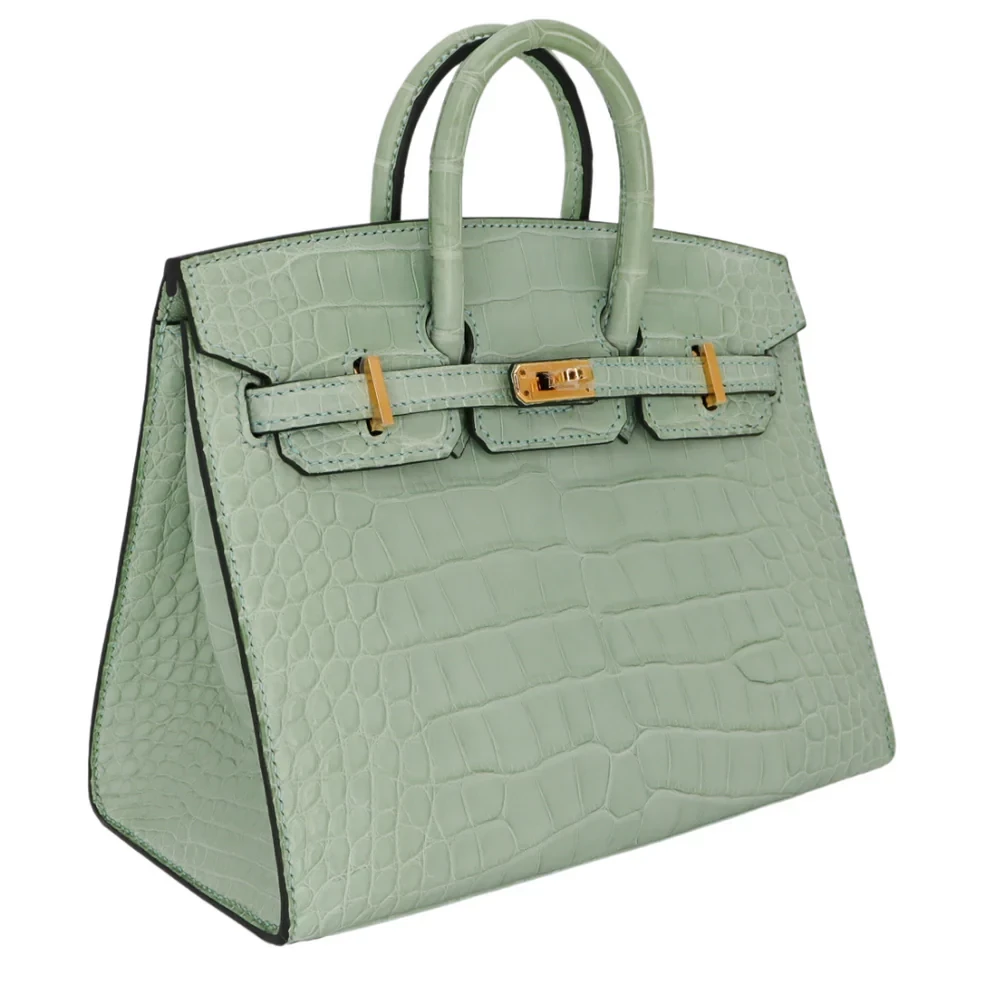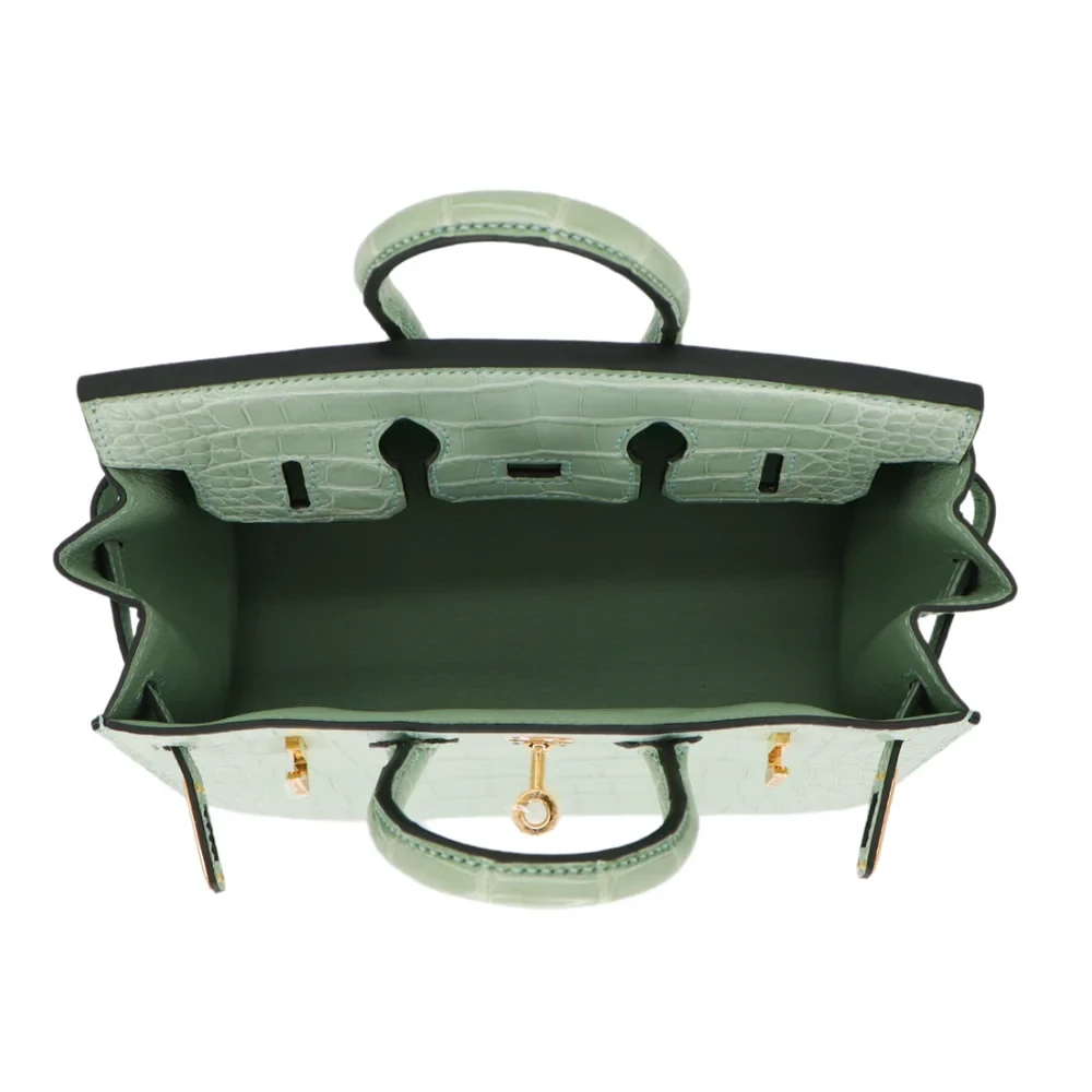 This Hermès like Birkin 20 in Vert D’eau is a lovely small bag in pale green matte alligator. The gold hardware adds a pretty contrast to the soft color. Its 20cm size is ideal for evenings out or when you just need a few items. The sellier style keeps its perfect box shape wherever you go. You can fit your phone, cards, keys and lipstick with no problem. The quality is so good you’ll want to carry it every day. This mini bag makes any outfit look more expensive instantly.
