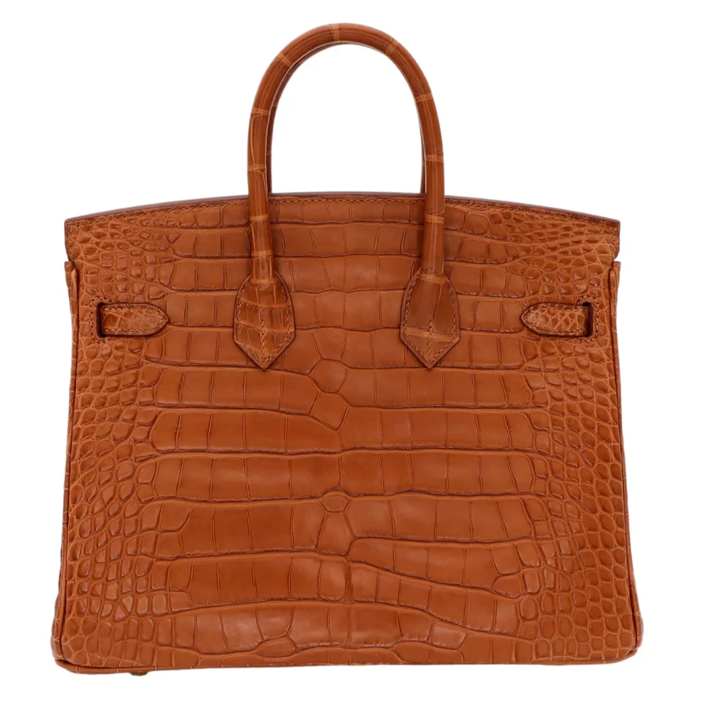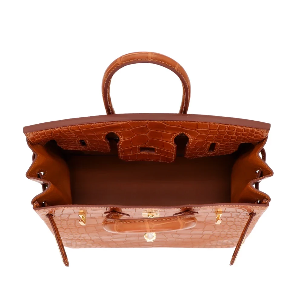 This Hermès style Birkin 25 features Gold matte alligator leather for a bold, sun kissed finish. Gold hardware complements the warm tones for seamless elegance. The 25cm size fits essentials like your phone, wallet, and keys. Matte alligator leather resists scratches while retaining its refined texture. Pair it with neutrals or jewel tones to amplify its glow. Lightweight yet structured for all day wear. A golden ode to understated luxury.