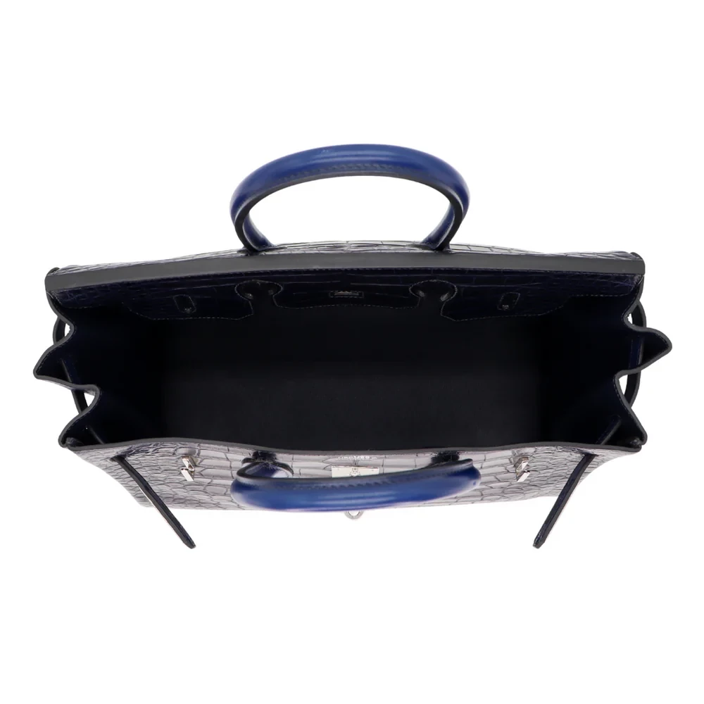 This Hermès style Birkin 35 TriBleu Indigo leather blends navy, cobalt, and sapphire tones. Palladium hardware enhances the ombre 35cm design. Soft leather resists scratches and ages gracefully. Roomy enough for travel essentials or work files. Pair with neutrals to let the blues shine. Lightweight and perfect for jet setters. Oceanic elegance in every stitch.