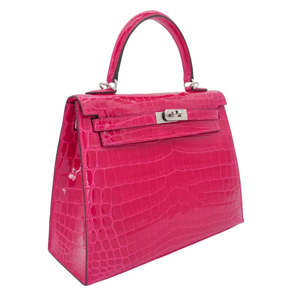 This Hermès style Kelly 25 features Framboise crocodile in raspberry red. Palladium hardware cools the bold pink tone. The 25cm sellier design holds essentials securely. Glossy finish resists wear while shining brightly. Pair with neutrals for striking contrast. Perfect for date nights or cocktail parties. Unapologetic luxury for bold hearts.