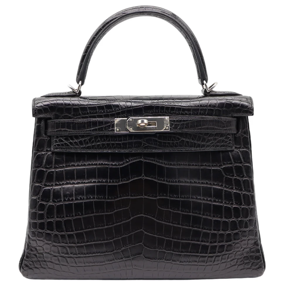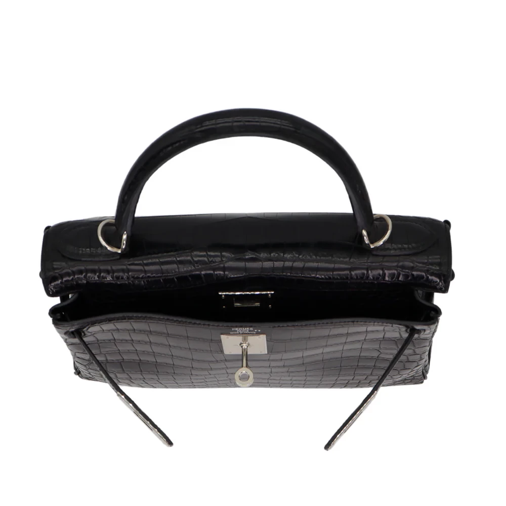 This Hermès style Kelly 28 uses black matte crocodile leather. Palladium hardware enhances the stealthy look. The 28cm retourne design fits work essentials. Scratch resistant exotic leather lasts years. Perfect for making quiet power statements. Understated opulence for professionals.