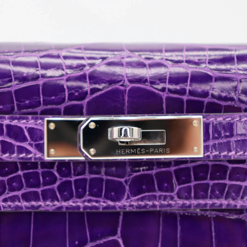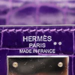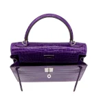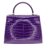 This Hermès style Kelly 28 uses Ultraviolet crocodile. Palladium hardware cools the bold purple. The 28cm sellier style holds files securely. Glossy leather resists stains. Makes neon statements in boardrooms. Electric luxury for rule breakers.